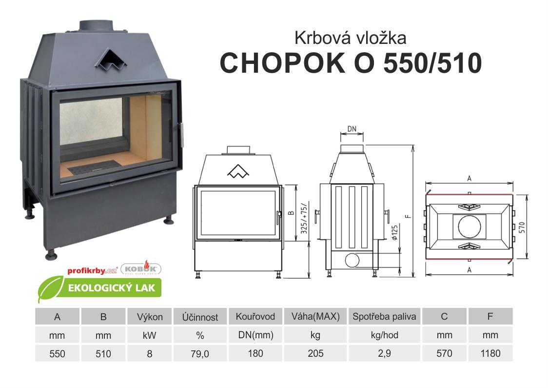 Krbová vložka KOBOK CHOPOK 550 500 O oboustranná, portál 550x500 mm, průměrný výkon 8kW, účinnost 79%, použití pro sálavé, akumulační a teplovzdušné stavby