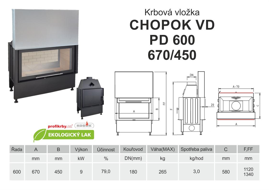 Krbová vložka KOBOK CHOPOK PD VD 600 (670) 440 s výsuvem, přikládací dveře, portál 670x440 mm, průměrný výkon 9kW, účinnost 79%, kouřovod 160mm, použití pro sálavé, akumulační a teplovzdušné stavby, výroba:Kobok. servis:Profikrby