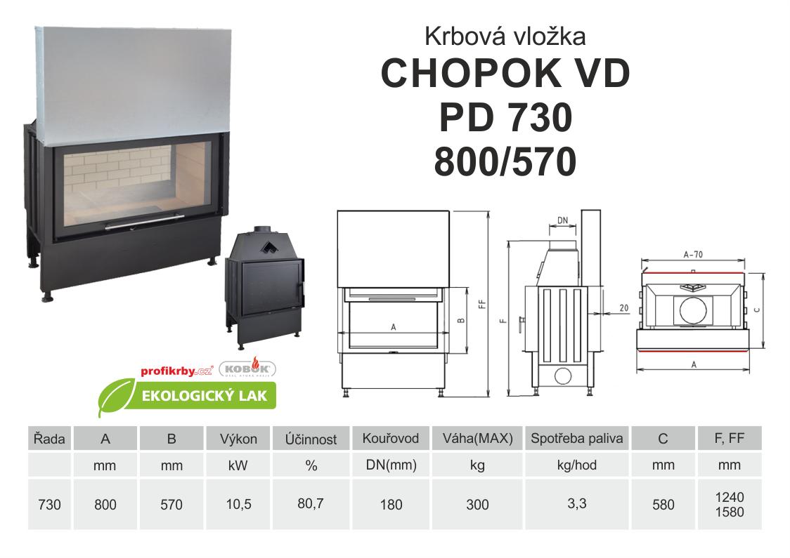 Krbová vložka KOBOK CHOPOK PD VD 730 (800) 560 s výsuvem, přikládací dveře, portál 800x560 mm, průměrný výkon 10,5kW, účinnost 79%, kouřovod 180mm, použití pro sálavé, akumulační a teplovzdušné stavby, výroba:Kobok. servis:Profikrby
