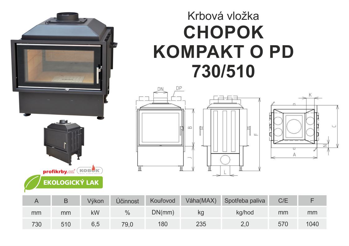 Krbová vložka KOBOK KOMPAKT PD 730 500 přikládací dveře, portál 730x500 mm, průměrný výkon 6,5kW, účinnost 79%, kouřovod 180mm, použití pro sálavé, akumulační a teplovzdušné stavby, výroba:Kobok. servis:Profikrby