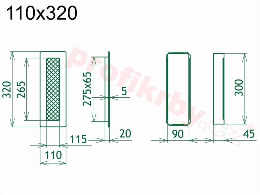 | Rozměr mřížky ( venkovní rozměr rámečku) (mm) | 110x320 mm |