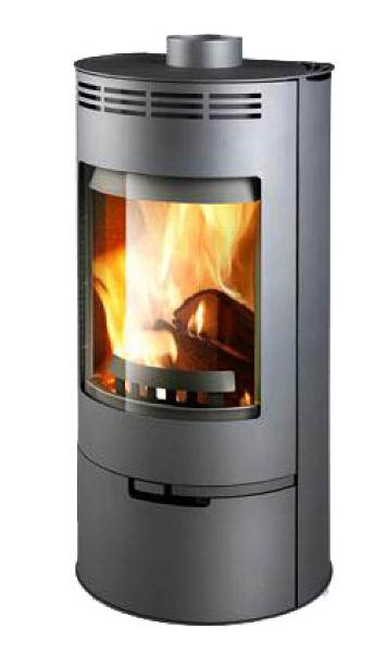 Rohová, kulatá sloupová krbová kamna s průměrným výkonem 7,5 kW, rozsahem výkonů 3,8 až 11,2 kW, účinnost 80%.