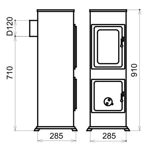Vývod kouřovodu je zezadu pro kouřovod o průměru D120. Přikládací dvířka a dvířka popelníku jsou těsněná sklotextilní šňůrou. Na obou dvířkách je klapka
