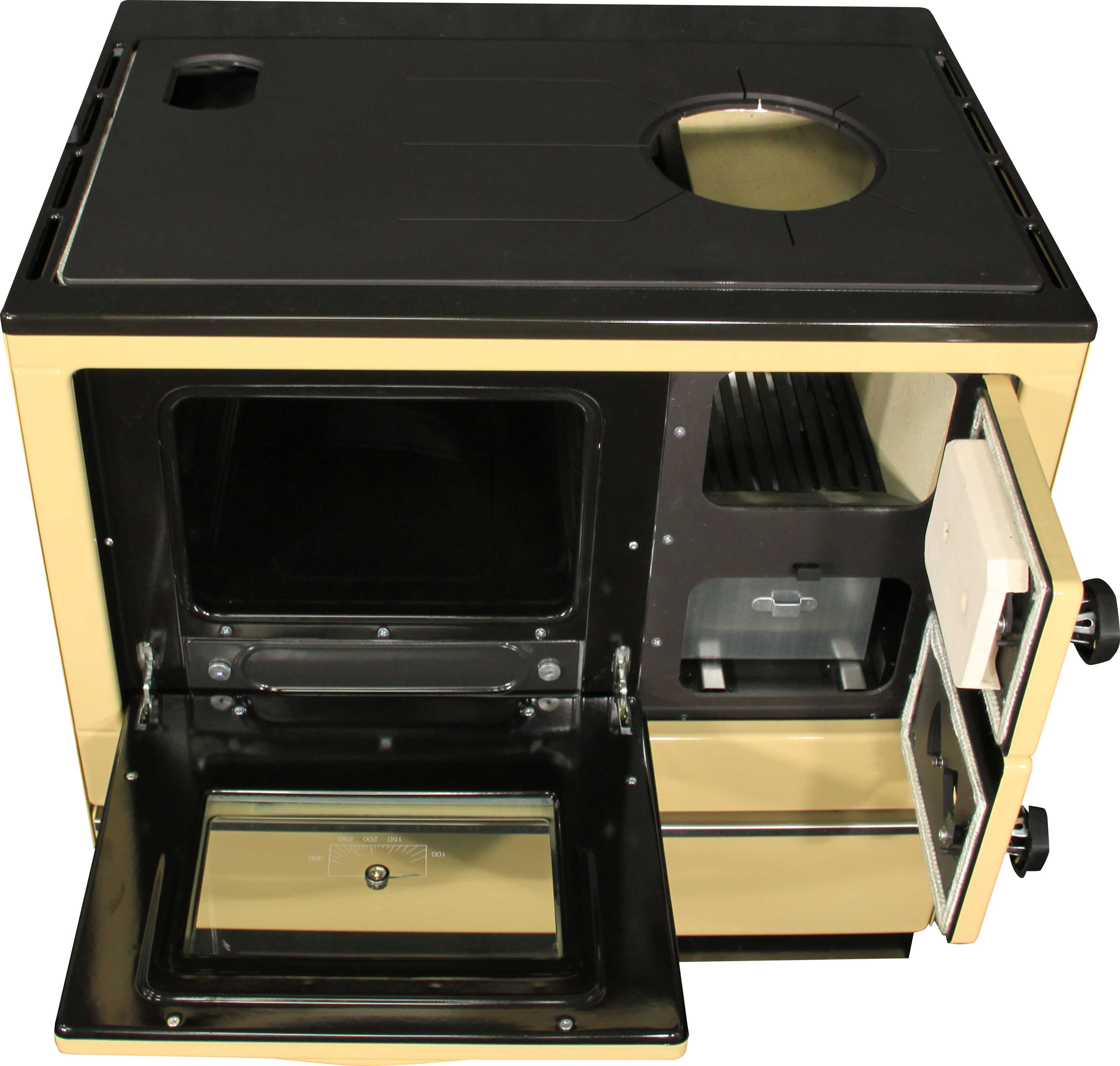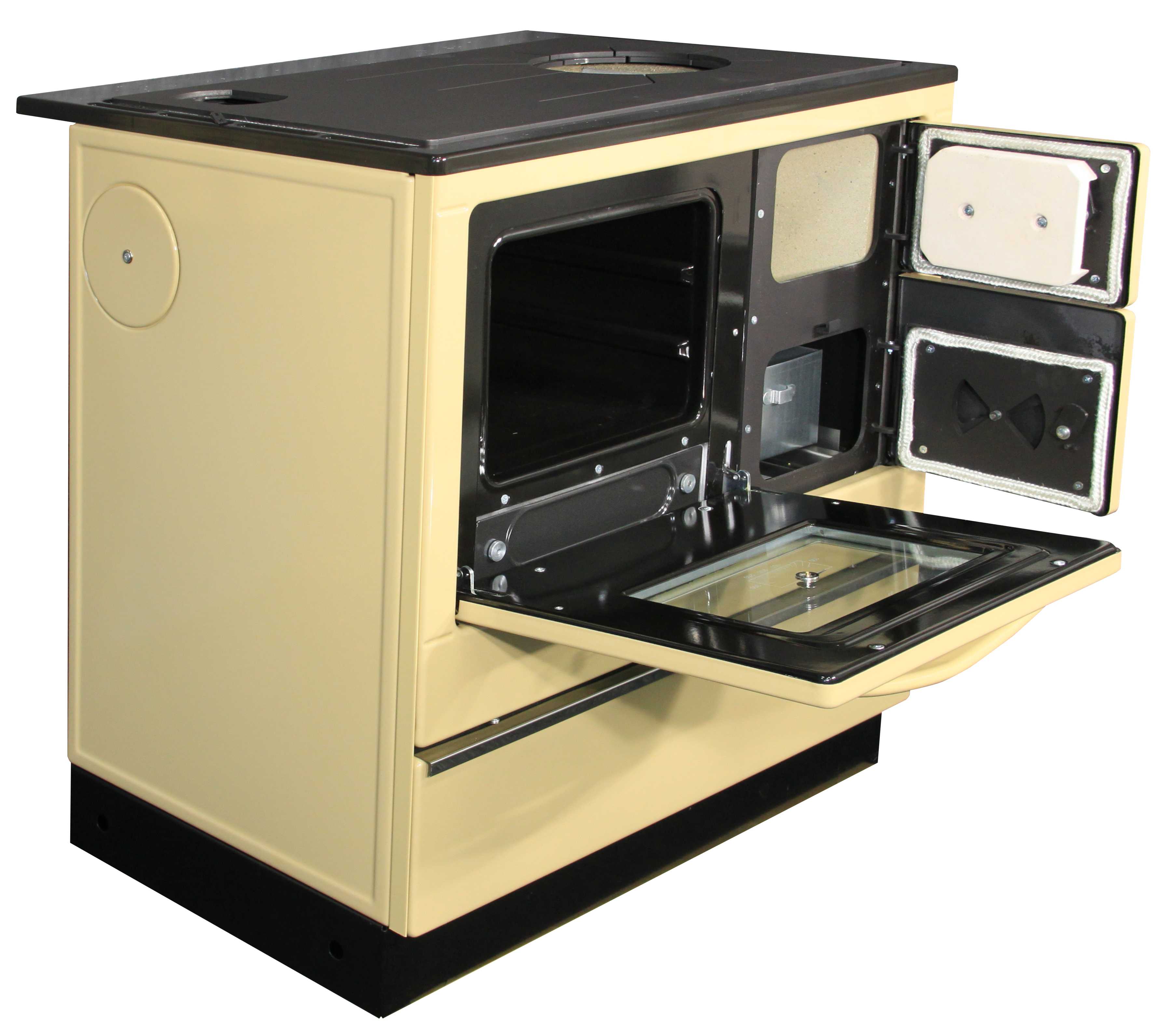 Vedle ohniště je smaltovaná trouba na pečení s dvěma páry nosných žeber na příslušenství. Je uzavíratelná odnímatelnými dvířky, které jsou k obrubě trouby přitlačované ocelovými pružinami. Pod troubou je otvor na čištění spodní části sporáku, který je zakrytý smaltovaným víkem.